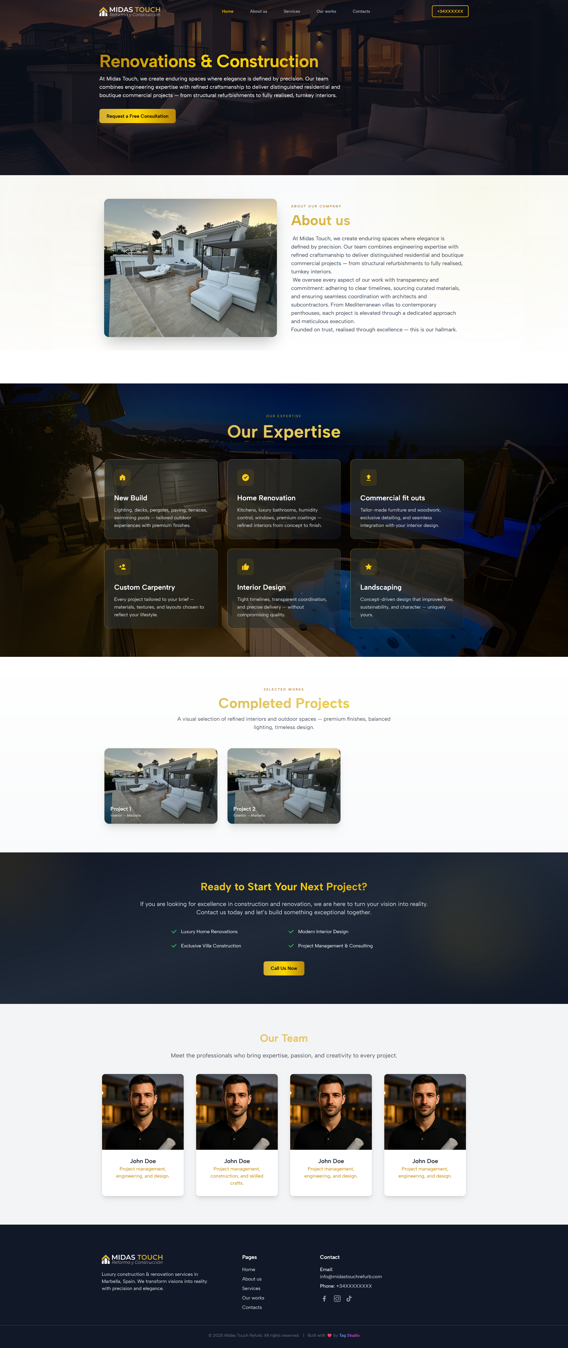 Un brand vizual complet (logo + website) și un site rafinat, rapid și ușor de utilizat, care reflectă profesionalismul și stilul Midas Touch și susține poziționarea companiei ca partener de încredere pentru proiecte premium de construcții și renovări.