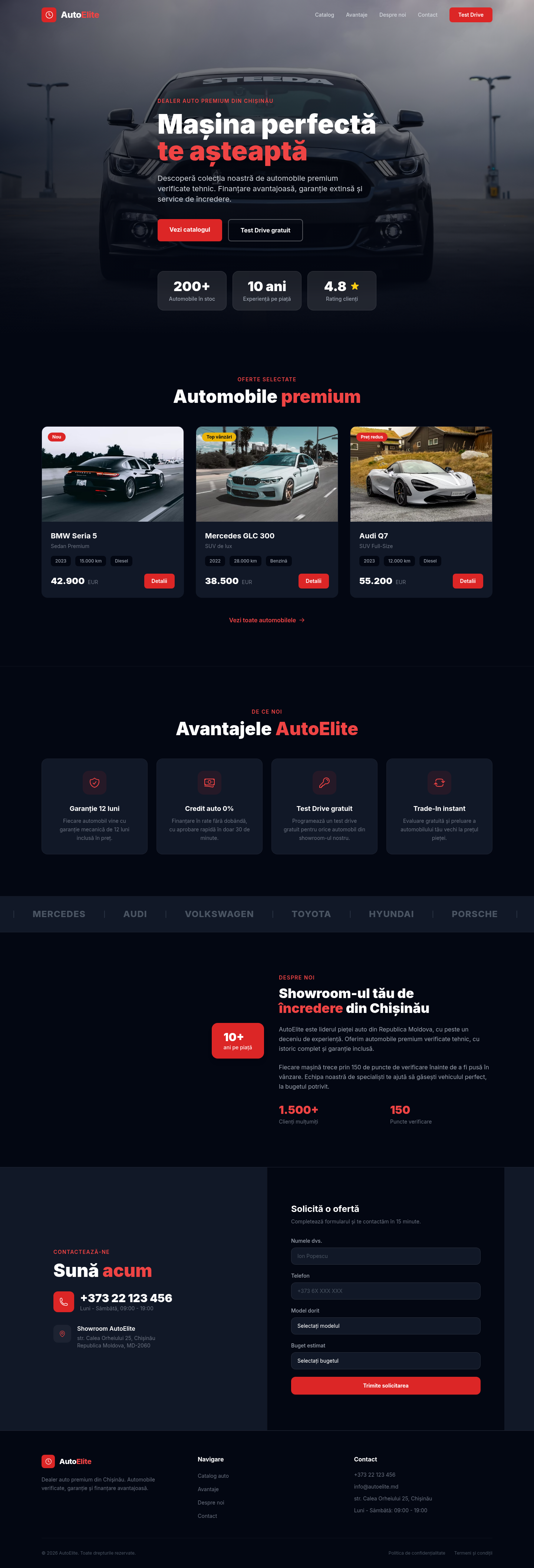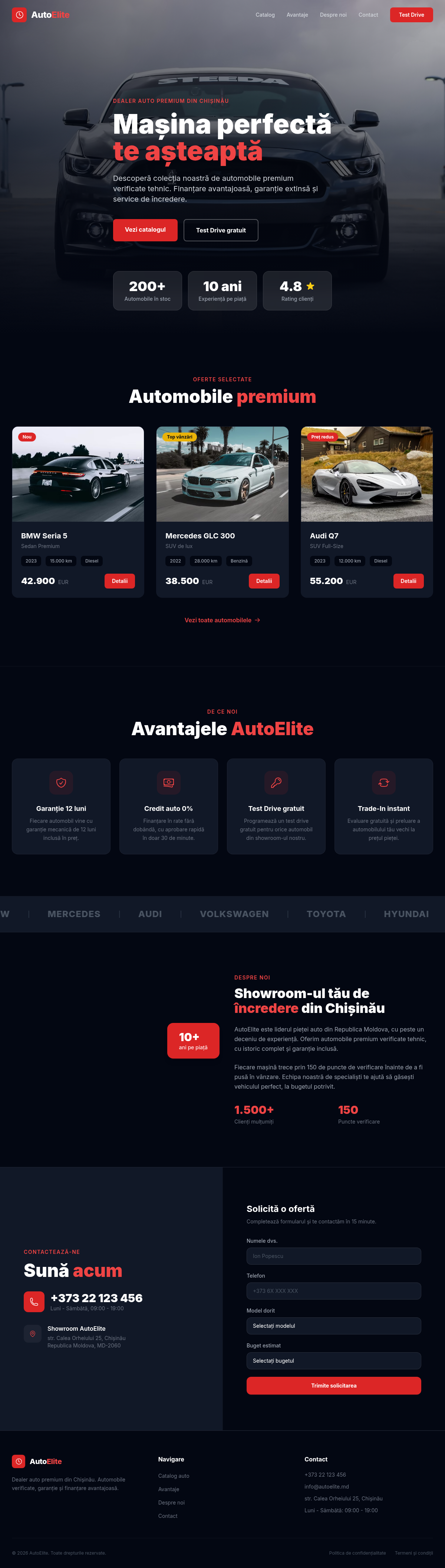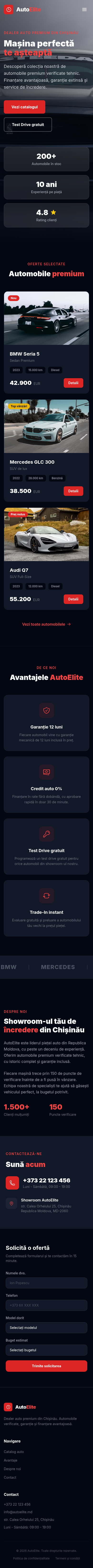 AutoElite, премиальный автосалон в Кишинёве, нуждался в онлайн-присутствии, отражающем качество предлагаемых автомобилей. Конкуренция на автомобильном рынке Молдовы высока, и профессиональный сайт может стать решающим фактором.