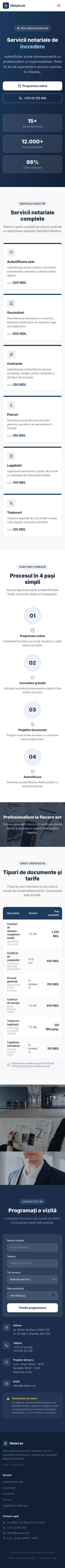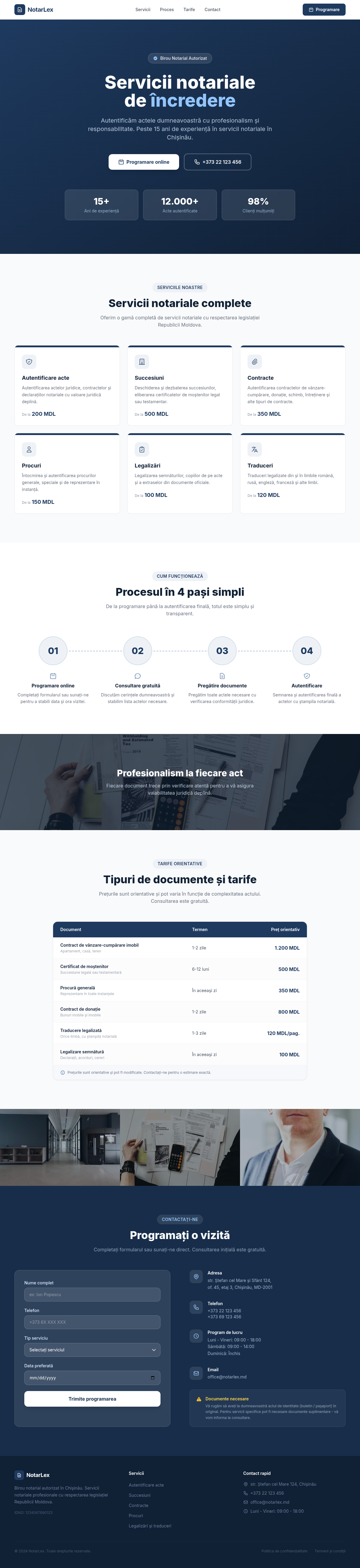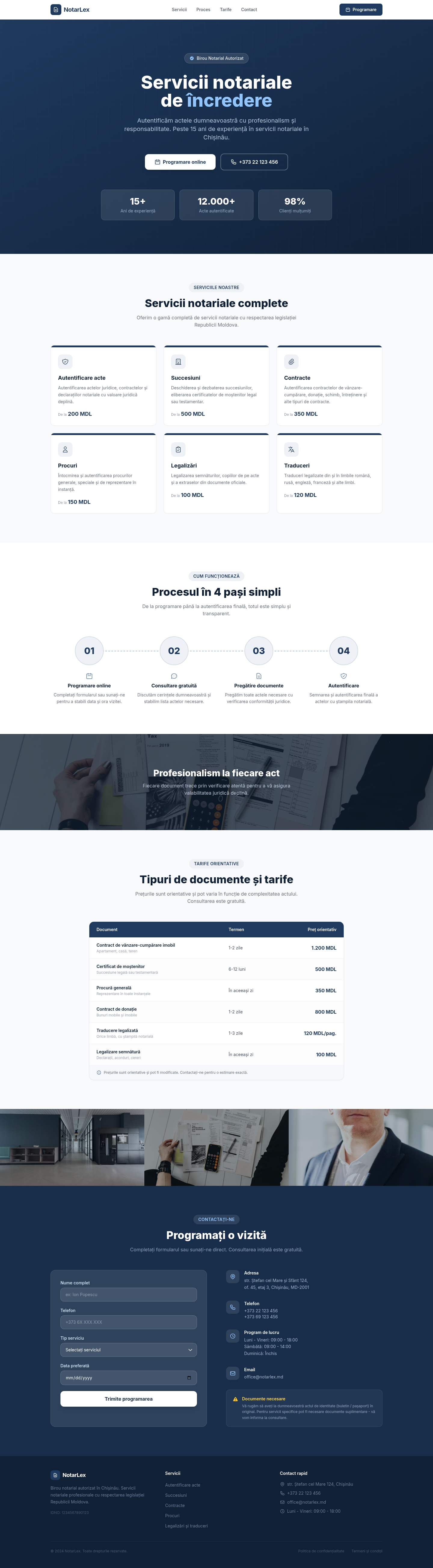 Нотариальной конторе NotarLex в Кишинёве требовался профессиональный и формальный сайт, чётко представляющий нотариальные услуги и тарифы, облегчающий онлайн-запись на приём.