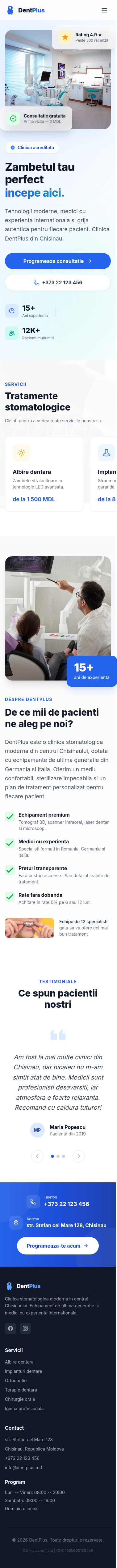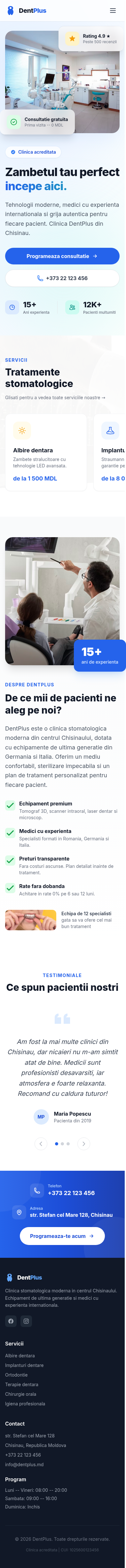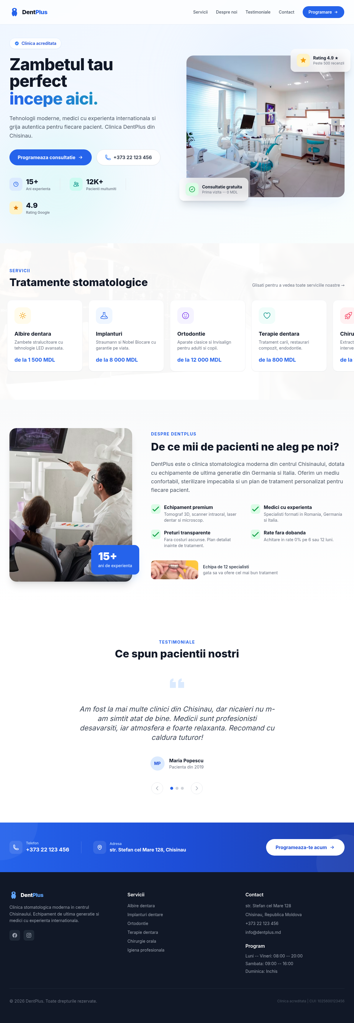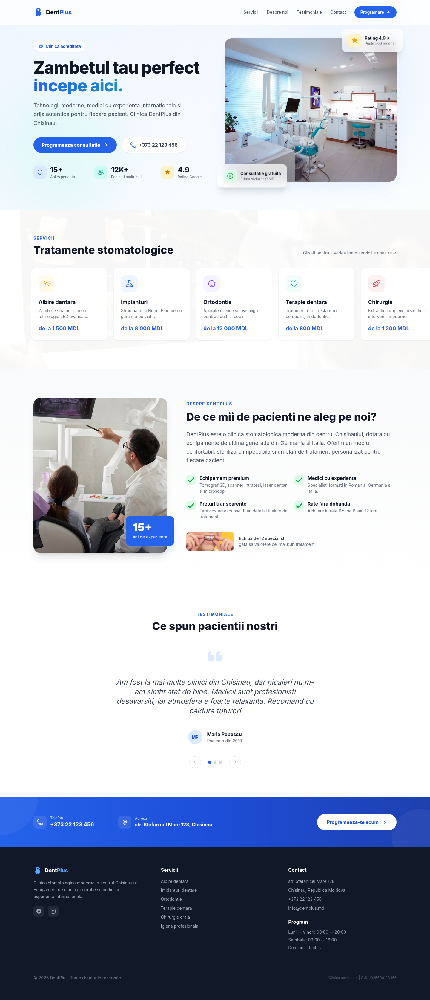 Стоматологической клинике DentPlus в Кишинёве требовался современный сайт, вызывающий доверие и упрощающий онлайн-запись. Старый сайт был устаревшим и не оптимизирован для мобильных устройств.